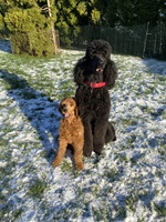 Im Januar 2024 ist bei uns eine rote Großpudelhündin eingezogen. Sie heißt Rosalie und ist jetzt die beste Freundin unserer schwarzen Großpudelhündin Jeannie. Rosalie (jetzt 16 Wochen alt) bekommt seit einigen Wochen das Anifit Junior.